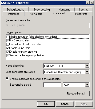 я обращался не к компу по адресу 192.168.0.61, а к компу на новой кафедре. Отсюда и ошибка с именем пользователя. Решается проблема 2 кликами. В настройках нашего DNS сервера dnsmgtm.msc Открывает меню. GATEWAY (У нас так сервер называется). Меню Properties (Настройки). Там находим вкладку Advanced (Дополнительно) и включаем очистку устаревших записей DNS сервера. "Enable automatic scavenging of state records". Я поставил раз в сутки. И проблема решена. Если сразу не решится, то просто удаляем записи о глючных компах из DNS оснастки. Они сами появятся заново, при перезагрузке тех рабочих машин. Не за что... Комментарии